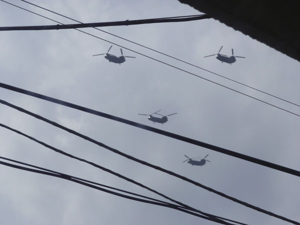 そのほかにも、通常のヘリコプター(疎いのでよく知らん)も5機編隊で、通過していきました。