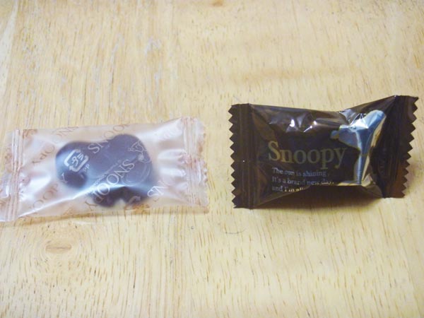 スヌーピーチョコは2種類の味で、左のチョコはカカオがまぶしてある大人な味。
