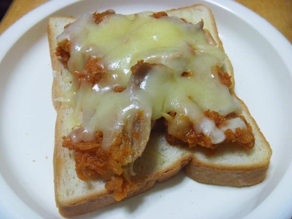 レッドホットの名前の通り、ケンタッキーフライドチキンのレッドホットチキンを割いて食パンに乗せて、その上からとろけるチーズをたっぷり乗せる。
