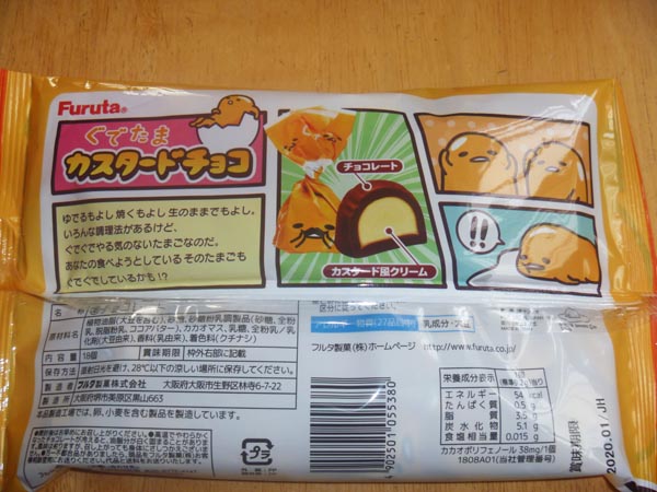 チョコの中の、ぐでたまをイメージしたと思われるカスタード風クリームが美味しかったですよ。フルタのチョコレートは可もなく不可もなくというか、良い意味で普通に美味しいのが好み。