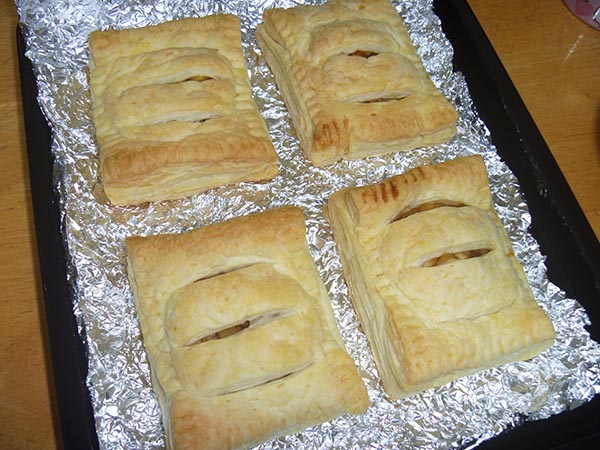 リンゴを細かく切ってバターと砂糖と一緒にじっくり炒めて、あとは生地に乗せて形成し、オーブンで焼くだけ。本当は卵黄を塗るともっとつやつやで美味しそうな見た目になるのですが、まぁ今回は実験も兼ねて簡単に。