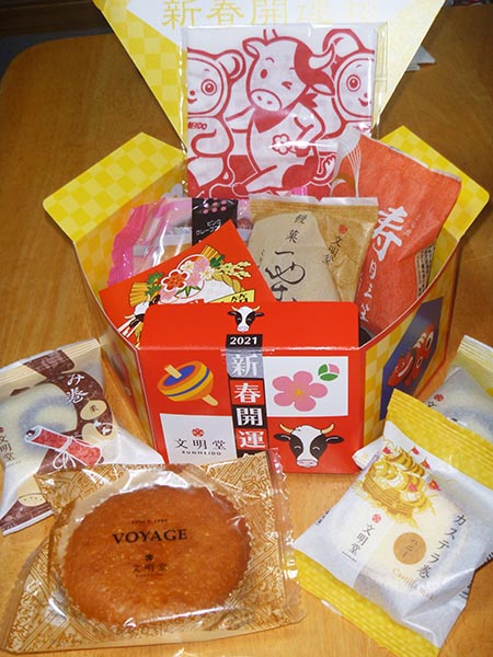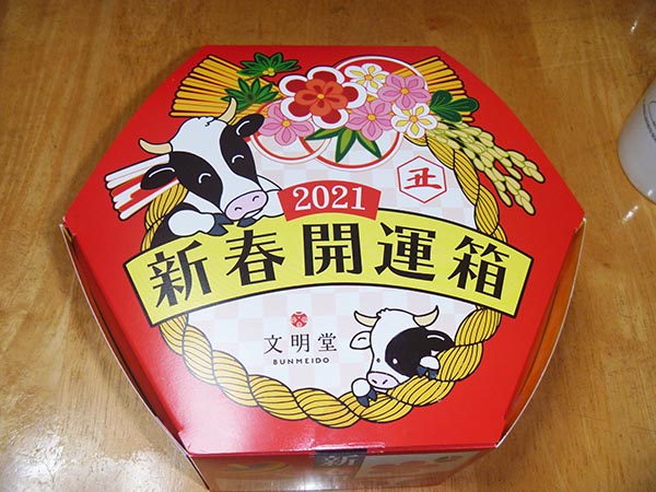 その後、ぶらぶら散歩がてら買い物に行ったのですが、文明堂の新春開運箱(お菓子の詰め合わせ)が売っていたので思わず購入してしまいました。
