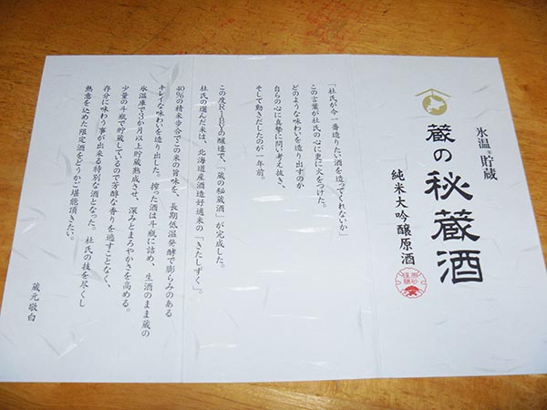 杜氏が今一番作りたい酒、の答えがこの蔵の秘蔵酒のようですが、「国士無双 氷雪囲い熟成」が作れなくなったと聞いた時のことを思い出してしまう。
