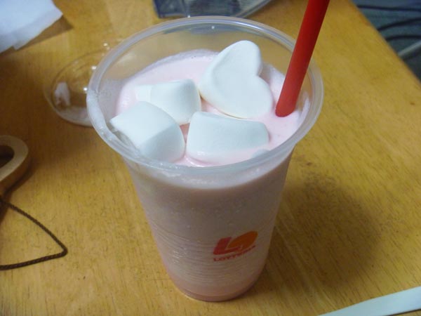 ハート型のマシュマロが4個入っているいちごミルク風味のシェイク。