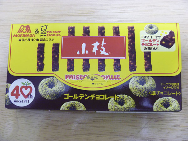 小枝! ミスタードーナツとのコラボですって! 森永の小枝、40周年だそうです。 小枝は子供のころから好きなチョコだったなぁ。 パフとアーモンドのサクサク感がなんともいえないのよねぇ。 で、ゴールデンチョコレートとのコラボです。 サクサク感がノーマル小枝よりアップしていて、サクポリ感と言うんでしょうか? さらに全体的に甘味が強い。 ドーナツのイメージなんでしょうね。 甘さが強めのチョコが好きな人にはお勧めですよ~♪