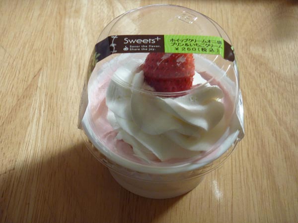 「カスタードプリンに、苺ムースをのせ、苺ホイップクリームとホイップクリームを高く絞り(オニ盛)、中央に苺をトッピングしました。」(ファミマの商品紹介より)