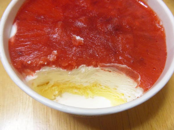 イチゴのソースは酸味があって、アイスの甘さとソースの酸味でバランスは良いかと思います。